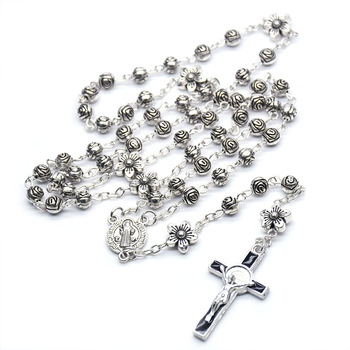 6Mm Vintage Verzilverd Metaal Rose Bloem Rozenkrans Ketting Kruis Ketting Religieuze Gift Giveaway